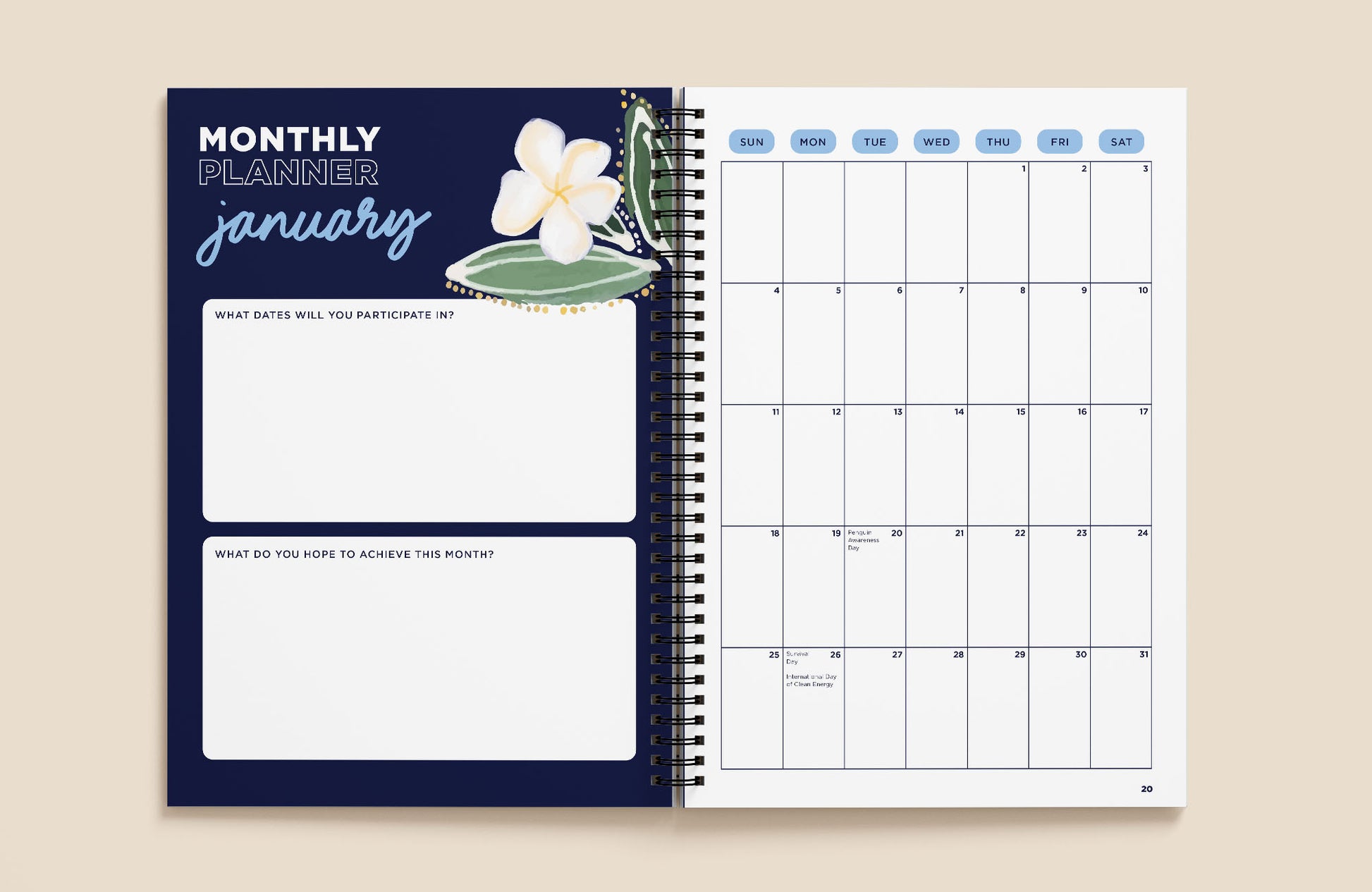 - Monthly planner with pre and post month reflection prompts (8 pages per month)