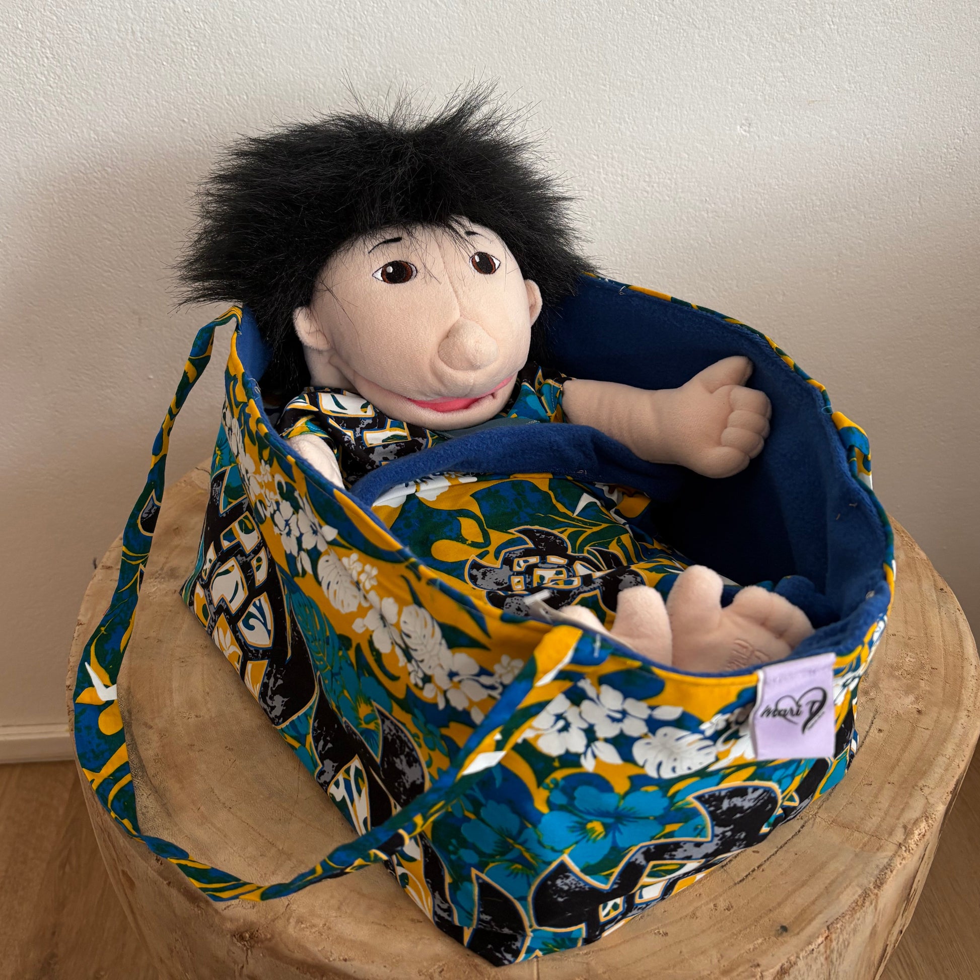 Bala's island dress and carry bag are handmade in Ingham by Marisa, who carefully stitches and designs each outfit using vibrant, Island-inspired fabrics that celebrate the beauty of Torres Strait Islander culture. Every puppet is unique, with stunning colors and patterns that reflect the rich heritage of the Torres Strait.