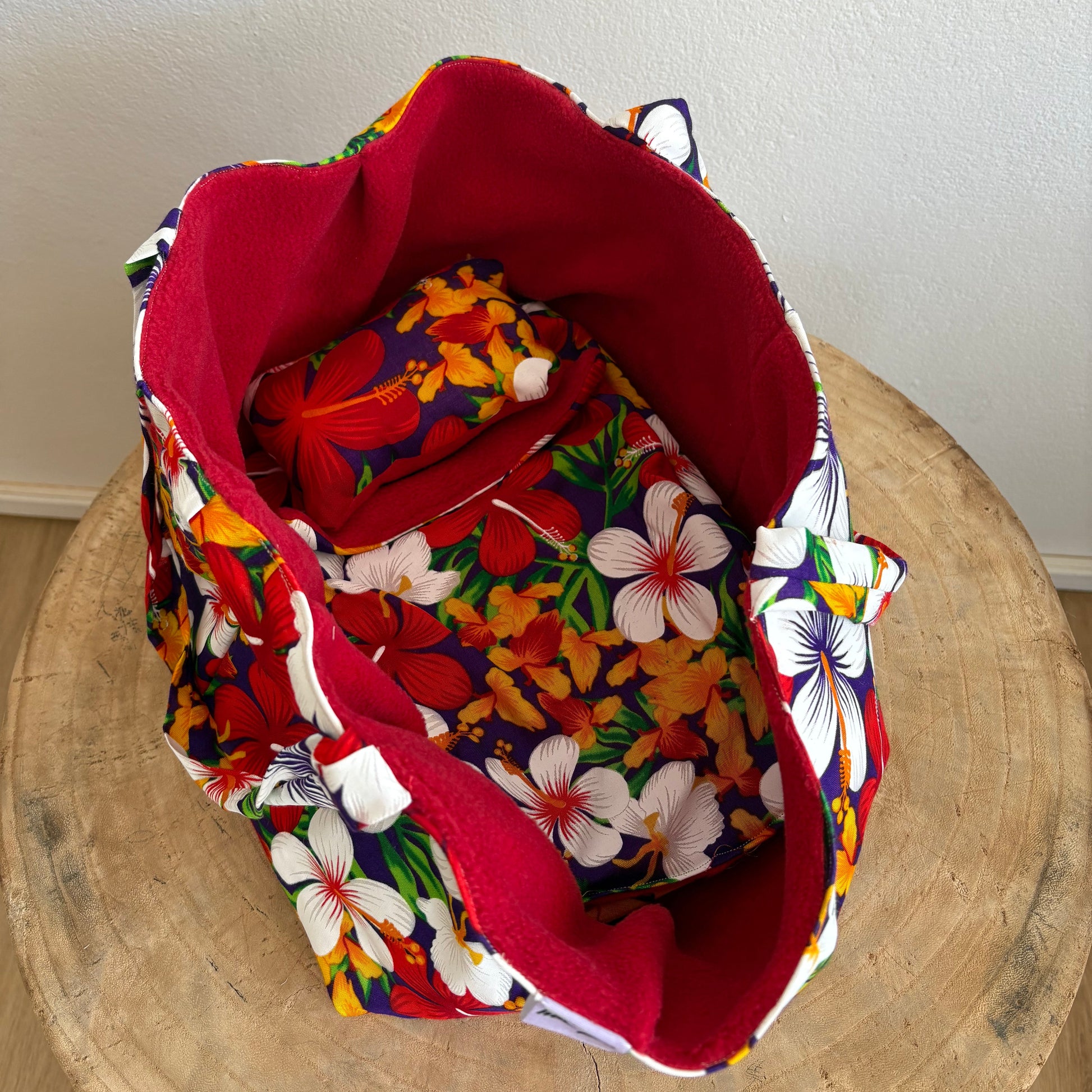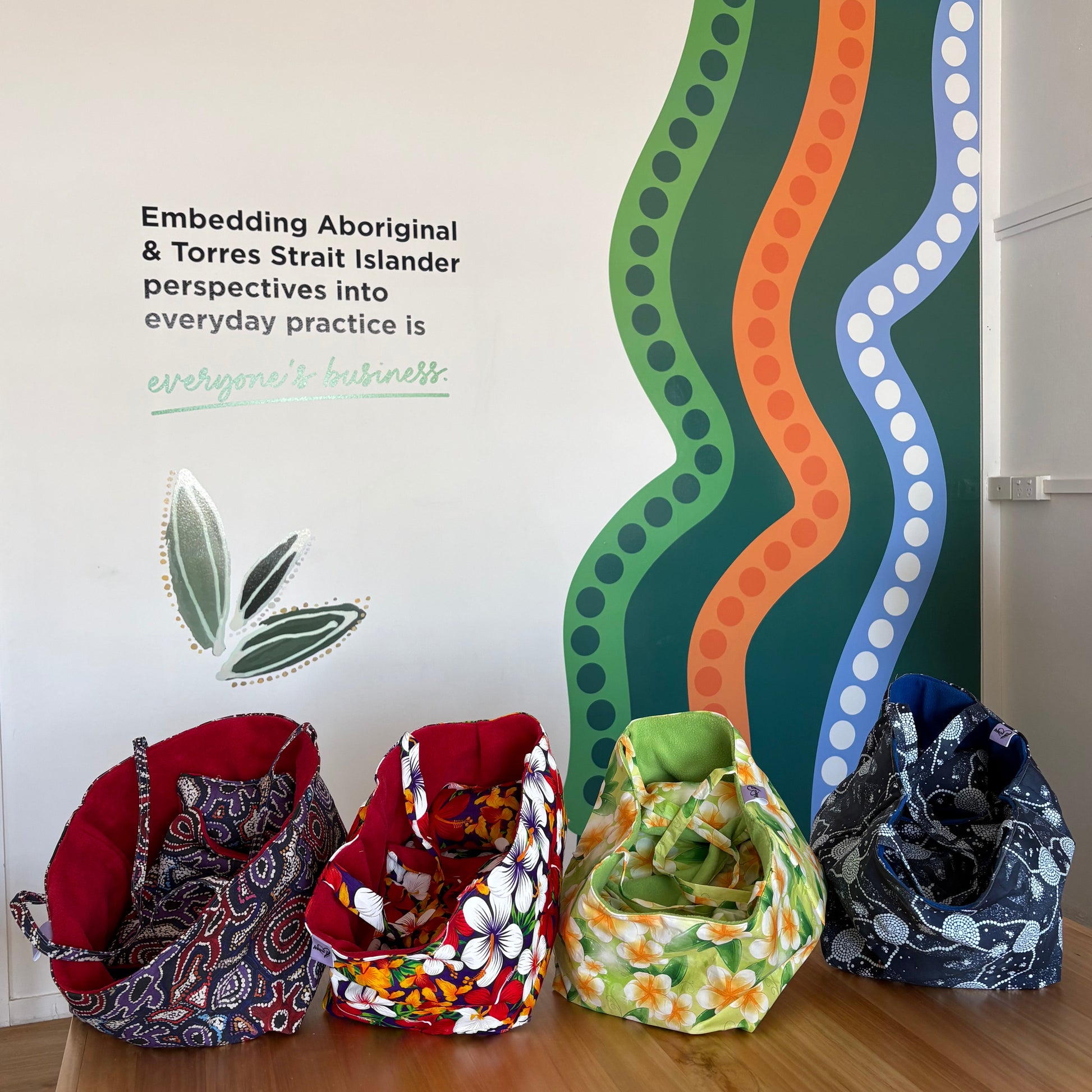 This carry bag is handmade in Ingham by Marisa, who carefully stitches and designs each outfit using vibrant, Island-inspired fabrics that celebrate the beauty of Torres Strait Islander culture. The stunning colors and patterns reflect the rich heritage of the Torres Strait.