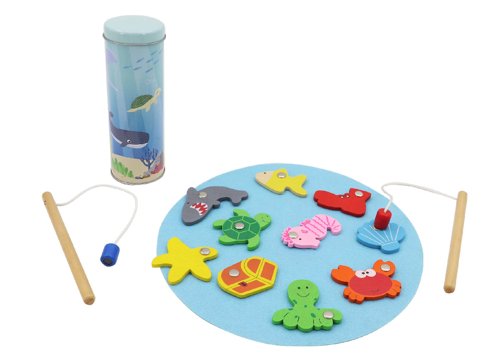 Explore the thrill of fishing with our Fishing Game in a Tin. This compact set includes nine colorful sea animals, magnetic rods, and a charming playmat, providing hours of fun and improving hand-eye coordination. Perfect for on-the-go adventures and a delightful way to reel in family fun.